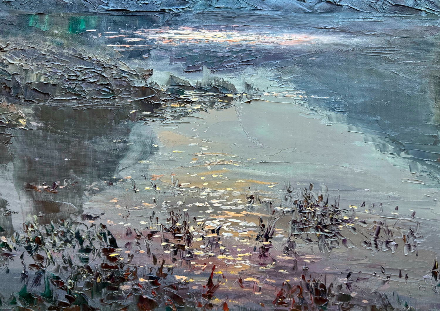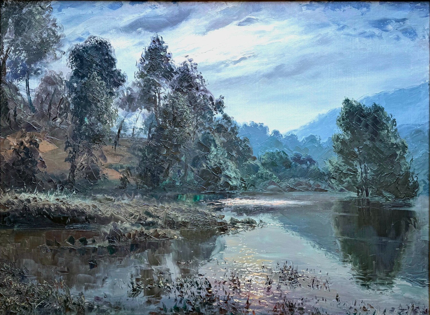 Hace unos días estuve tomando un café con Eduardo y se emocionaba recordando aquellos tiempos y me contó que él acompañaba al Sr George, en algunas ocasiones, al lugar donde el artista plasmaba su obra, concretamente estuvo con él mientras pintaba la verdad de este Nocturno en Cazorla (parque natural de la provincia de Jaén en España). Mi padre se enamoró del cuadro a primera vista y lo adquirió en 1978.